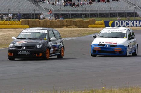 Per Poulsen (t.v.) og Patrik Ernstson kan stadig true Jesper Davidsen i kampen om Fleggaard Renault Clio Cup. (Foto: Birger Vilén - www.euroracer.org)