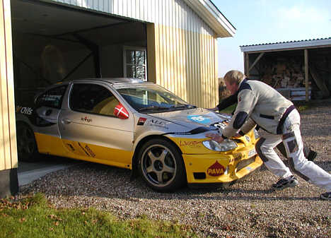 Sammen med sin trofaste mekaniker, Anders Madsen skubber Brian Madsen Renault'en tilbage i garagen. (Foto: Sven Lautrup)