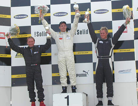 Vinderens af første løb svenske Patrick Ernstson, her flankeret af Henrik Larsen (2. pl.) samt Kasper Jensen (3. pl.). (Foto: Motorsporten.dk)