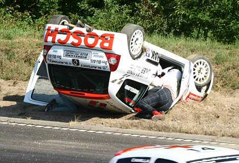 - Jeg ryger sidelæns ud i sikkerhedssandet, konstaterer Max Birkelund. - Til sidst foretager bilen en halv saltomortale over bagenden. Pludselig ser jeg derfor Ring Djursland i muldvarpe-perspektiv med hovedet nedad. I kampens hede sanser jeg heldigvis at slukke motoren, hvorefter tililende hjælper mig ud af den noget ubekvemme siddestilling.