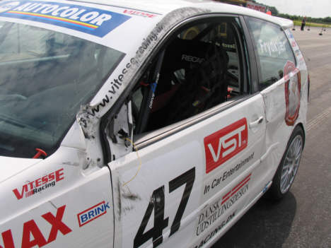 Det blev en såvel sportslig som økonomisk kostbar week end for VW Polo Cup-køreren Kennie Frydkjær Jensen (Fredensborg) og hans team, Vitesse Racing. Week end’en startede ellers perfekt, da Kennie Frydkjær under lørdagens frie træning var anden-hurtigste mand på banen – blot 0,06 sekunder fra Jørgen Vestergaard (Esbjerg) og med ’hele’ 0,3 sekunder ned til Jacob Ludvigsen (Århus).
