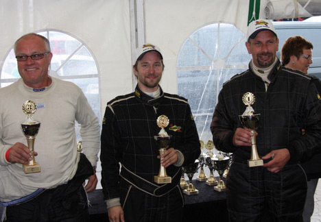 Præmier til kørerne i SS1 afd 7, Nils Davidsen på tredje pladsen, Mikkel Holck på anden pladsen og Jakob Borum på første pladsen. (Foto: Olfert)