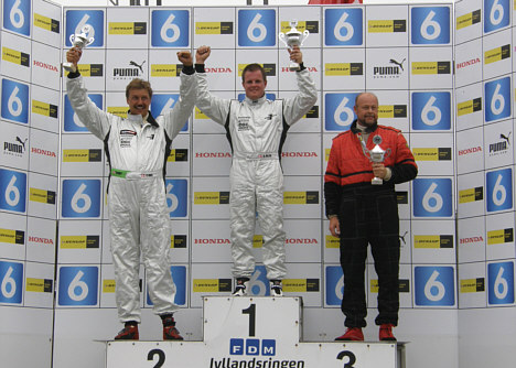 David Falch øverst på podiet, flankeret af teamkollega Peter Obel på 2. pladsen og Niels Ole Andersen på 3. pladsen. (Foto: Motorsporten.dk)