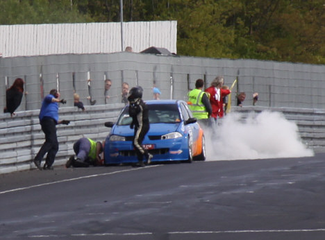 Igen i det andet løb kørte Jesper sig op på 2. pladsen i klassen, en placering han holdt lige til slutningen af 5. omgang, hvor bilen brød i brand på vej ud af banens sidste sving op mod start/mål linien.