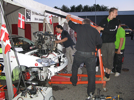 De fleste havde så nok givet op, og leget tilskuere resten af weekenden, men ikke team Profil Racing. Her er man vandt til at skrue hele natten, og faktisk nok mest tryg ved det. En hugger der havde en tilsvarende motor blev fundet på internettet, og det var heldigvis bare en times kørsel fra banen. Motoren blev hentet, og Brian, Michael, Jakob Emil, Michael Blom og adskillige andre af dem som normalt er konkurrenter, smøgede ærmerne op og gik i gang. Brians hårdeste konkurrent i 1600 Challenges interne Corolla klasse Leif Juhl kom også forbi for at give et nap med.
