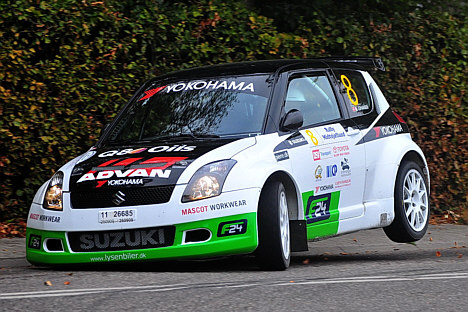 "Kun et danmarksmesterskab er afgjort, men tre står på spil, og derfor bliver Yokohama Gjønge Rally et løb, hvor kørerne vil satse alt. Det bliver et ægte action-rally," siger Linda Schrøder.  Rallystortalentet Kenneth Madsen har allerede har vundet et overlegent danmarksmesterskab i rally i klassen for tohjulstrukne standardbiler. Han kører sammen med sin erfarne codriver Carina V. Møller i en Suzuki Swift Sport, og de er urørlige forud for sidste løb. (Foto: Michael Eisenberg)