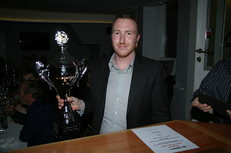 Med god mad på bordet og klip fra sæsonens gode løb på fjernsynsskærmene var der lagt op til hyggeligt samvær for de cirka 50 deltagere.  |  |  |  |  |  Mestrene fra de respektive klasser blev behørigt hædret med pokaler efter forretten. Klasse 1 blev vundet af Joakim Ottesen fra Norge. (Foto: Gripping Media) |