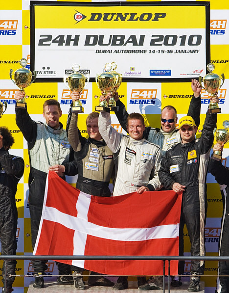 Kl. 14.34: Dan Träger, Martin Sally, Nick Reimersø, Brian Børger og Anders Majgaard indtager podiet som vindere af A2-klassen i 24H Dubai 2010 med 497 kørte omgange af den 5.39 km. lange bane