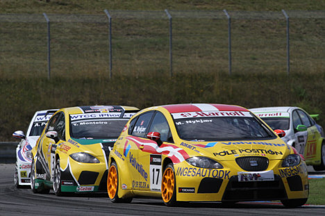 Lå nummer 3 i VM-løb, da motoren sagde stop Michel Nykjær var på vej mod et fornemt resultat i søndagens to løb til WTCC, verdensmesterskabet for standardbiler, i Brno i Tjekkiet, da motoren i hans Seat Leon TDI pludselig døde.  Løb 1: Michel Nykjær i Seat foran teamkammeraten Tiago Monteiro og den tidligere verdensmester Andy Priaulx i BMW. (Foto: Michael Eisenberg)