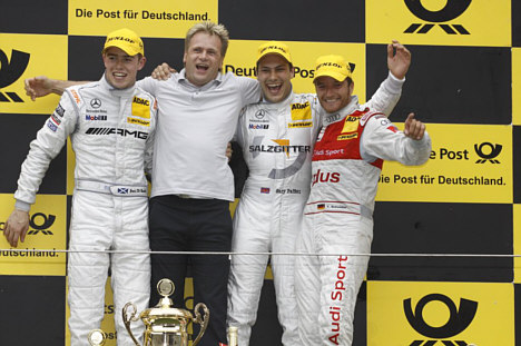 Vinderne på podiet. Til venstre Paul de Resta, i midten Gary Paffett, og til højre Timo Scheider.