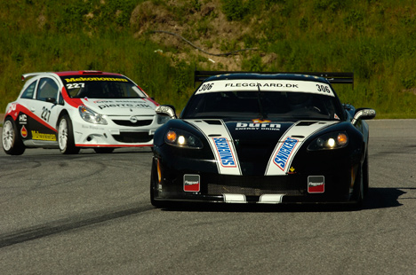 I Danish Endurance Championship er det vidt forskellige biler, som kæmper mod hinanden. Eksempelvis Fleggaard-teamets Chevrolet Corvette og DK Motorsports Opel Corsa. (Foto: Morten Alstrup)