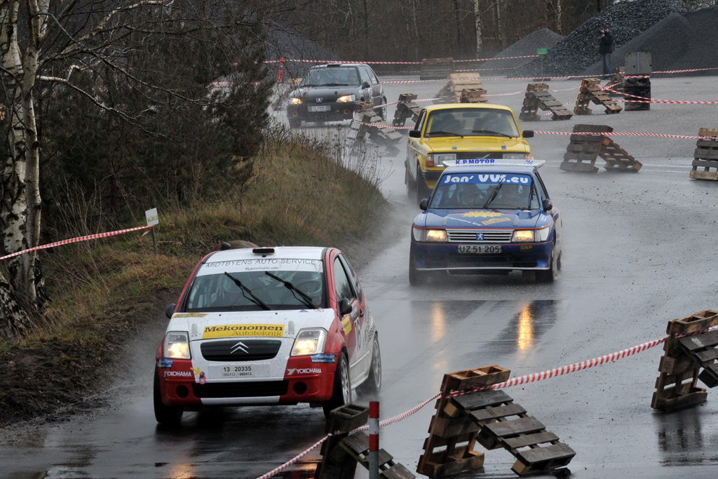 Frank Nielsen (forrest) stod for overraskelsen, da han i sin lille Citroën C2 kørte sig frem til en plads i finalen, hvor han slog en af de firhjulstrækkere, der ellers skulle kunne stå bedre fast på den våde og glatte asfalt. (Foto: Henrik Skovhuus)