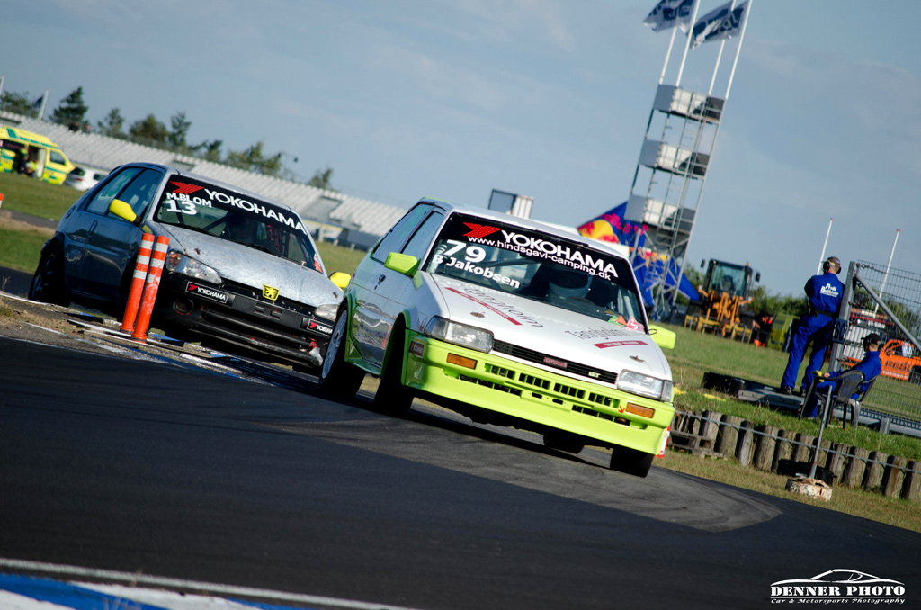 Brian Jakobsen var nok glad for at være tilbage i den lidt ældre Toyota Corolla, da motoren i hans normale bil, denne weekend kørt af Michael Blom, valgte at give op allerede i træningen. Her foran netop teamkollega Blom og dennes anden ”lånebil”. (Foto: Denner Photo)