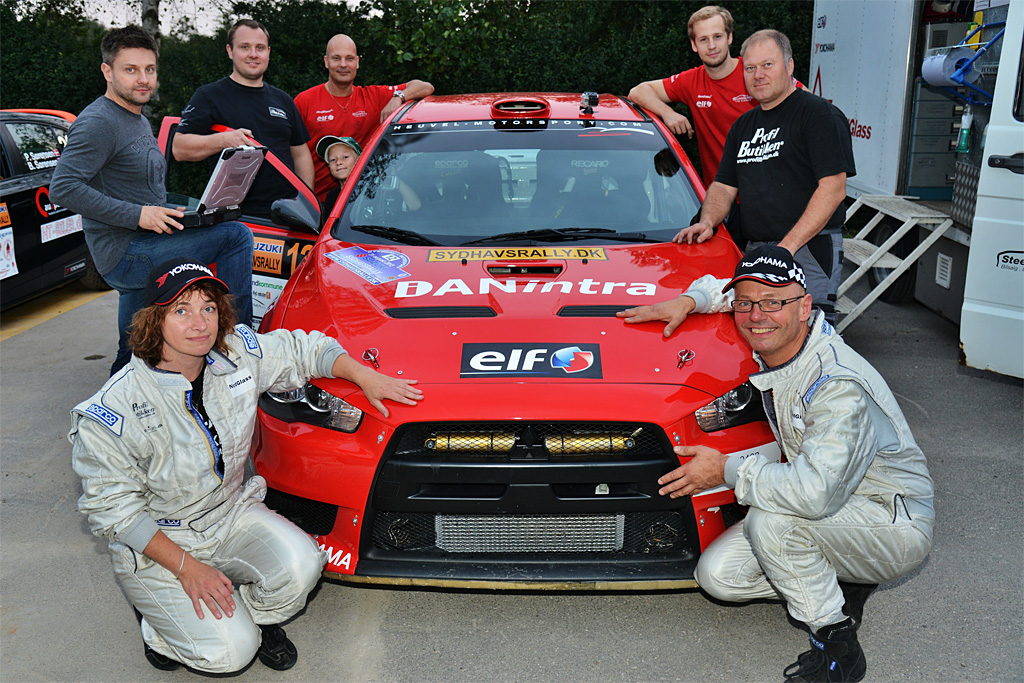 Steen Andersen (til højre) og Iben Louring glæder sig sammen med servicemandskabet over en fin start med deres nye Mitsubishi Lancer Evo X rallybil (Foto: Michael Eisenberg)