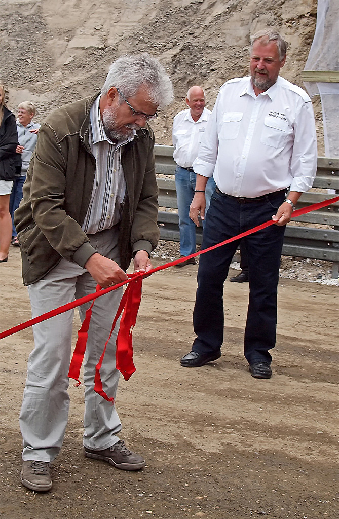 Rebild Kommune’s borgmester: Leon Sebbelin indviede det nye EM-banelayout ved at binde knuden op på den røde snor. MNJ’s formand: Finn Knudsen kikker på, og i midten skimtes ildsjælen: Kaj Storgaard.