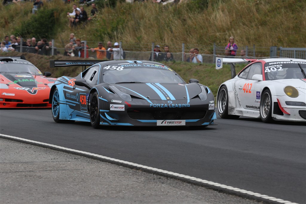 Det startede med den sædvanlige corvette bande i front, men en regnbyge under de sidste omgange fik byttet om på placeringerne, og løbet endte med at Per Frost vandt i sin Forza Ferrari 458, foran Rune Ydstebø i Chevrolet Corvette Z06R, og Andreas Kjærgaard i Scotty GT.  Per Frost (Foto: Motorsporten.dk)