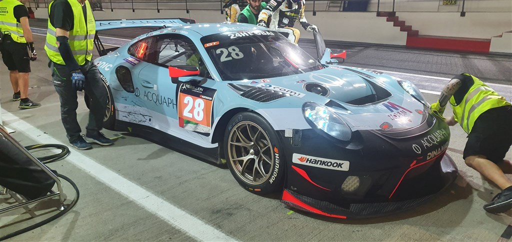 Mikkel O. Pedersen fik sovet og var klar til at komme i den lyseblå Porsche 911 GT3 R sidst på aftenen. Men han kom aldrig ud at køre i løbet. ”Lige inden jeg skulle i bilen, kom der en ny Code 60-periode på grund af den kraftige regn, og det endte med, at arrangørerne valgte at rødflage og stoppe løbet,” siger han. ”Regnen fortsatte, og da banens dræn ikke var dimensioneret til så kraftig nedbør, stod flere og flere dele af banen under vand, og man opgav at fortsætte løbet. Det var virkeligt en øv-oplevelse, selv om vi blev nummer 3 i GT3-Am-klassen.”