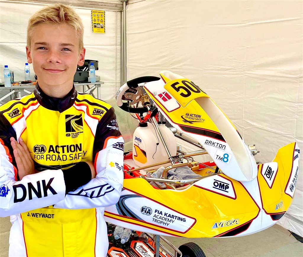 Jonathan Weywadt kører Dannebrog på podiet Første afdeling af FIA Karting Academy Trophy er afviklet – og det gik godt. Rigtig godt. Det lykkes nemlig Jonathan at placere sig blandt de forreste i samtlige heats. Og det betyder, at han hiver en fantastisk tredjeplads hjem til Danmark.