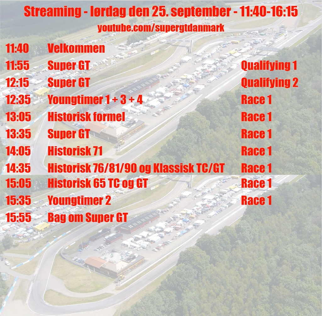 Hvis ikke det kan blive til en tur på den skånske bane for at opleve stemningen live, kan du følge med når der på vanlig vis bliver livestreamet på https://www.youtube.com/SuperGTdanmark - Lørdag fra kl. 11.40 og søndag fra kl. 9.00.