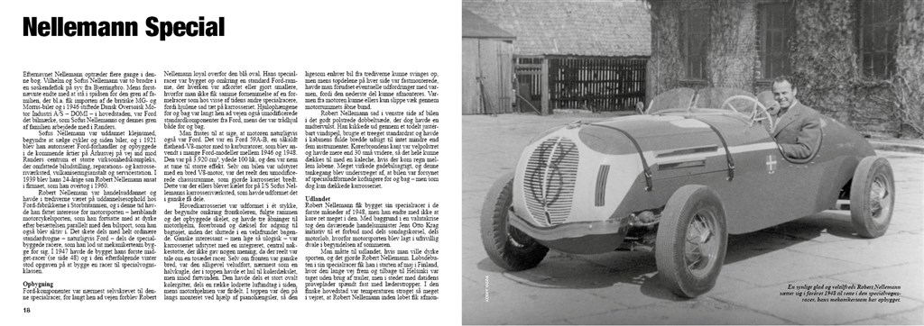 Racerbiler – Made in Denmark starter i årene efter Anden Verdenskrig. Det var længe før Roskilde Ring, Jyllands-Ringen mv. Dengang benyttede man travbaner og flere til lejligheden anlagte baner. Her er der et helt afsnit med fantastiske “kreationer”: Nellemann Special, Steyr Special,og endda en Morian Special med den gamle krigshelt, speedwaykører mv. bag rattet! Endnu flere fantastiske biler, der har virkelig været arbejdet i de små værksteder allerede dengang. Så følger sektioner med F3/ Midget, Formel Junior, Formel Vee frem mod nyere tiders Formel Ford, F3 og F2000 og senest sportsvogne.