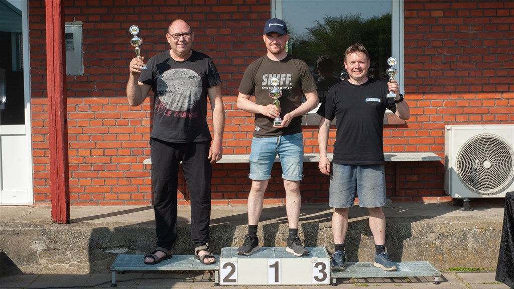 Heino Mejer øverst på podiet med Søren Bøgeskov og Jens Fisker på 2. pladsen og Kurt Mejer på en flot 3. plads i klasse 7B. (Foto: rallypics.dk / Viggo Johansen)