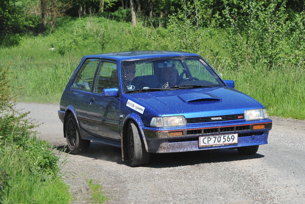 Normalt deltager Kim Bach Sørensen og datteren Julie Damgaard Sørensen i denne blå Toyota Corolla 1600 GT fra 1986, men de er henholdsvis løbsleder og løbslederassistent ved SMKG Classic den 11. april. (Foto: Morten Alstrup)